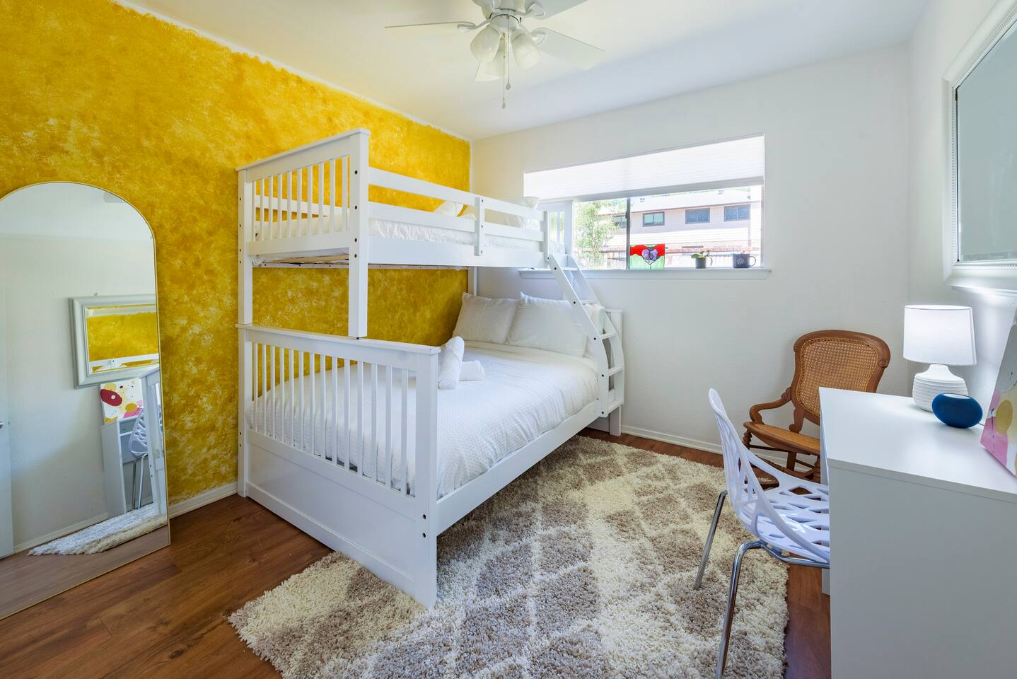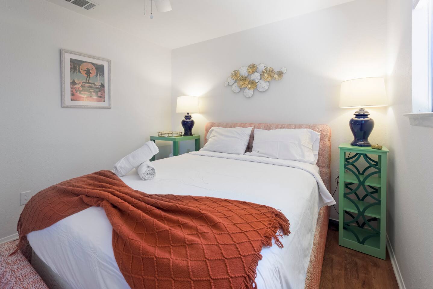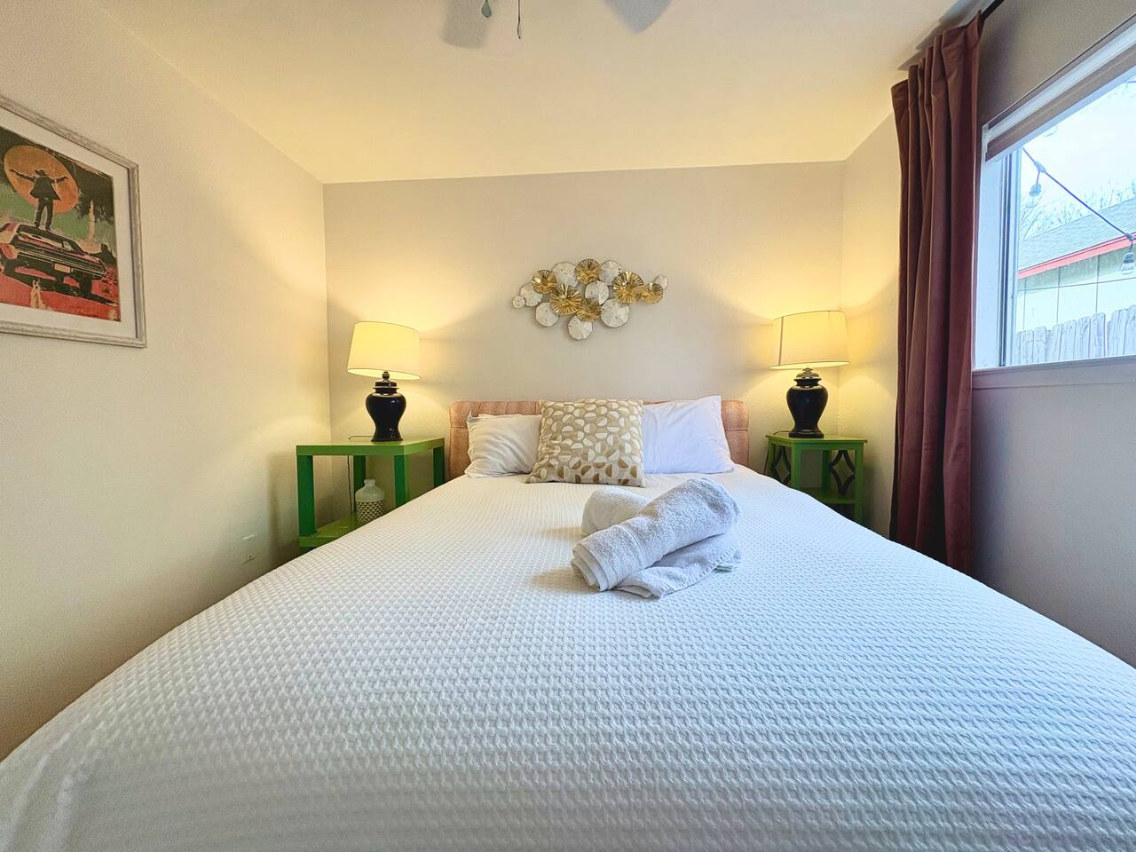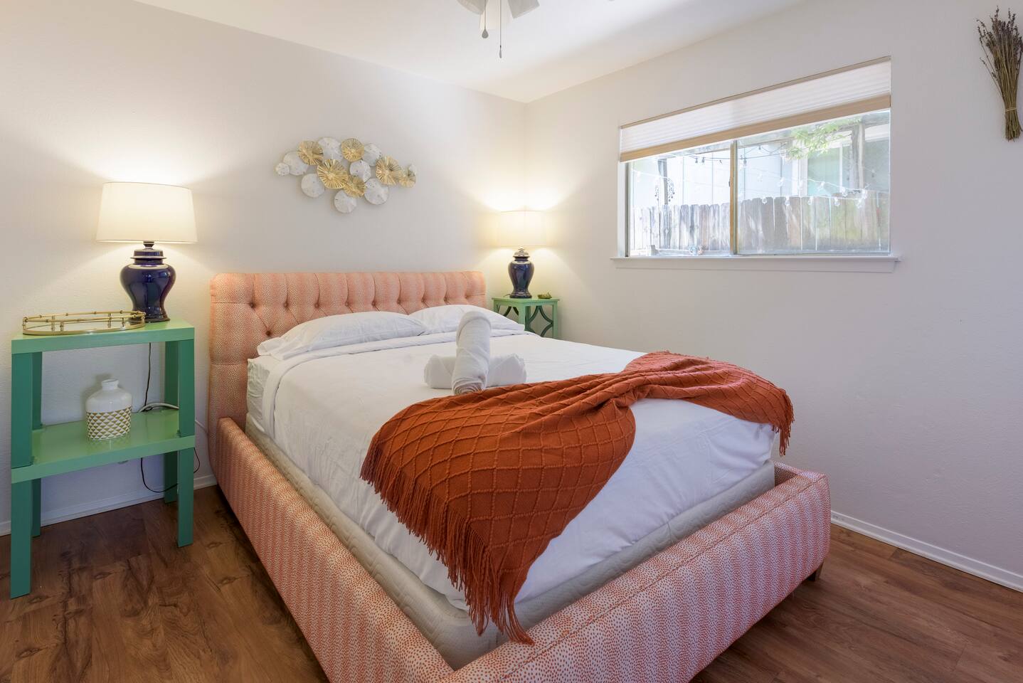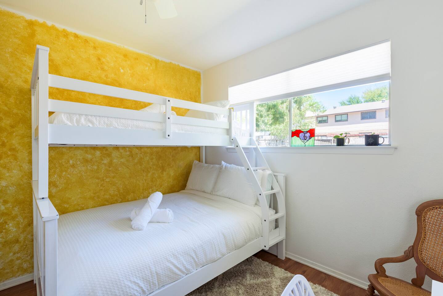 Welcome to your cozy 3-bedroom, 2-bathroom home in South Austin, designed for relaxation and connection. The bright, open-concept living area features high vaulted ceilings, creating a wonderful sense of space that flows seamlessly into a dining area and a fully equipped kitchen. Key Features: * **Living Area:** Gather for a movie night with the large pull-down projector screen. * **Kitchen:** A fully stocked kitchen with all the essentials to whip up a feast. * **Workspace:** A dedicated workspace with high-speed WiFi is available for remote work or planning your Austin adventures. Bedrooms & Bathrooms: * **Primary Suite:** Features a comfortable Queen bed and an attached full bathroom with a modern walk-in shower for added privacy. * **Bedroom 2:** Offers another restful Queen bed with soft linens. * **Bedroom 3:** Perfect for families, this room has a twin-over-full bunk bed set against a vibrant, cheerful wall. * **Shared Bathroom:** The hall bathroom includes a tub and shower combination, ideal for a relaxing soak. Backyard Oasis: Step outside to your private, fenced-in backyard to unwind. The cozy sitting area, illuminated by twinkling string lights, is perfect for evening chats. Gather around the fire pit for a starlit evening, or let your dogs play in the grassy space while you relax.