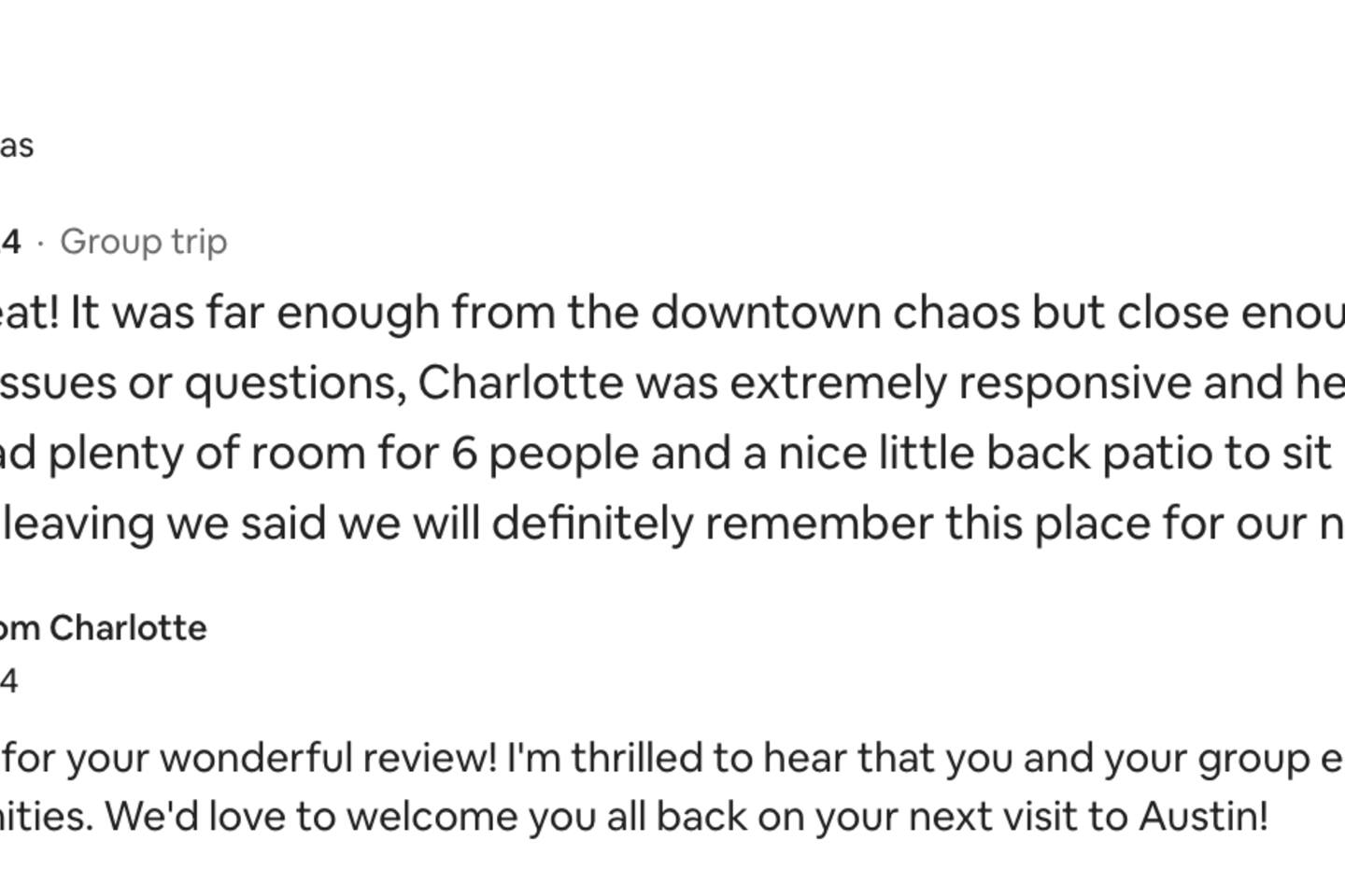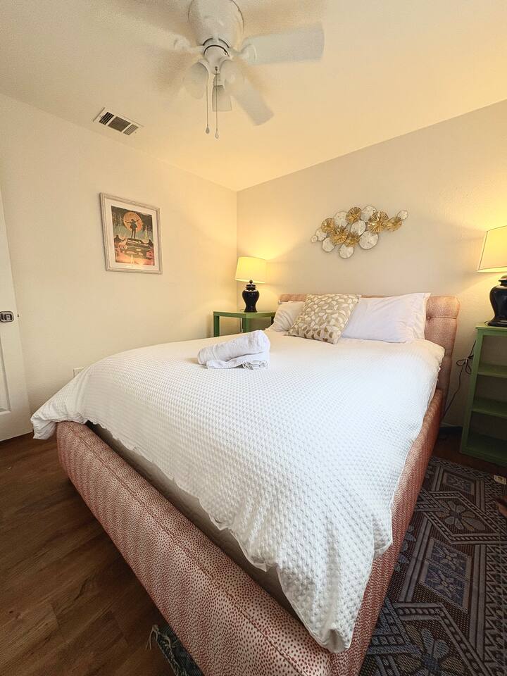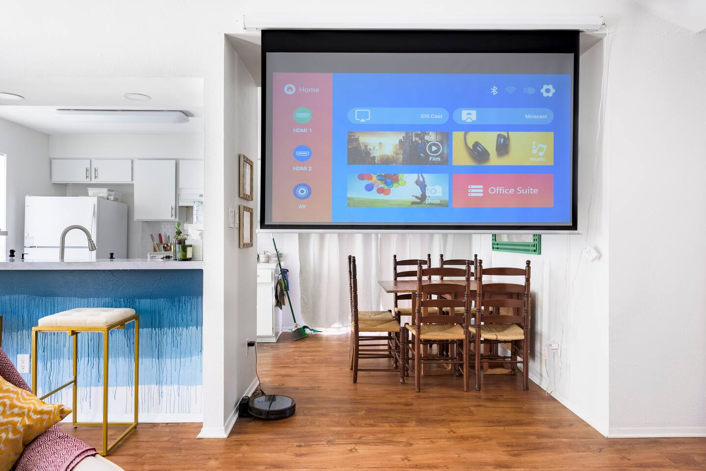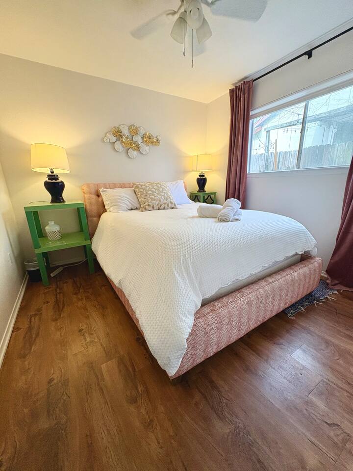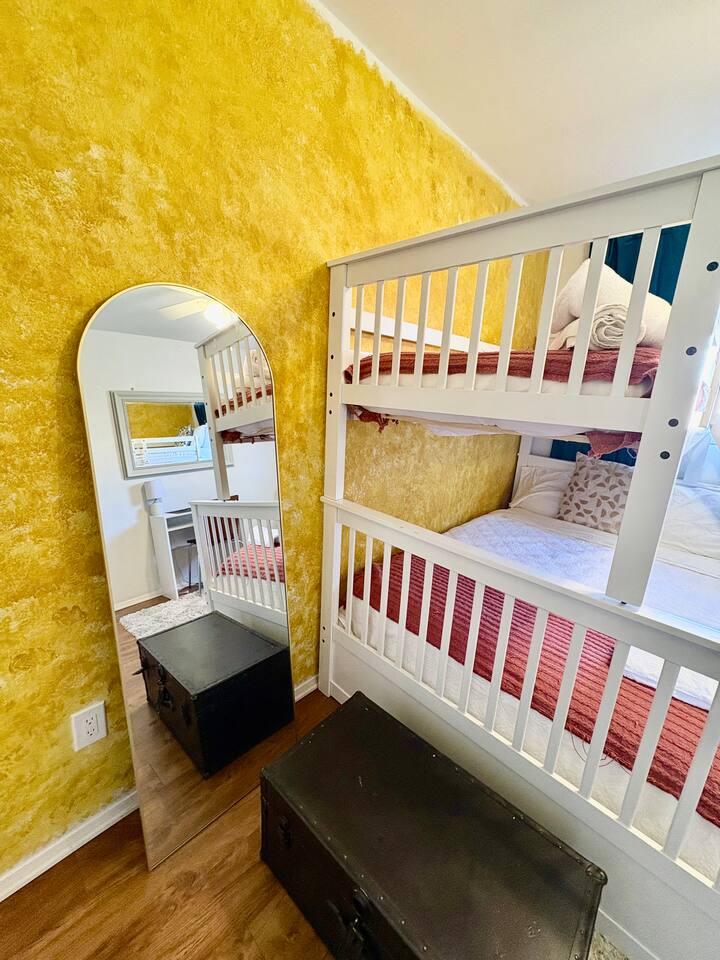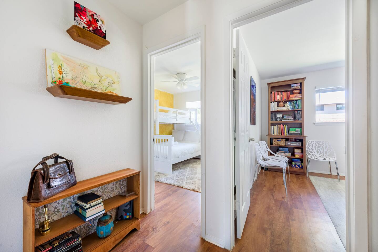 Welcome to your cozy 3-bedroom, 2-bathroom home in South Austin, designed for relaxation and connection. The bright, open-concept living area features high vaulted ceilings, creating a wonderful sense of space that flows seamlessly into a dining area and a fully equipped kitchen. Key Features: * **Living Area:** Gather for a movie night with the large pull-down projector screen. * **Kitchen:** A fully stocked kitchen with all the essentials to whip up a feast. * **Workspace:** A dedicated workspace with high-speed WiFi is available for remote work or planning your Austin adventures. Bedrooms & Bathrooms: * **Primary Suite:** Features a comfortable Queen bed and an attached full bathroom with a modern walk-in shower for added privacy. * **Bedroom 2:** Offers another restful Queen bed with soft linens. * **Bedroom 3:** Perfect for families, this room has a twin-over-full bunk bed set against a vibrant, cheerful wall. * **Shared Bathroom:** The hall bathroom includes a tub and shower combination, ideal for a relaxing soak. Backyard Oasis: Step outside to your private, fenced-in backyard to unwind. The cozy sitting area, illuminated by twinkling string lights, is perfect for evening chats. Gather around the fire pit for a starlit evening, or let your dogs play in the grassy space while you relax.