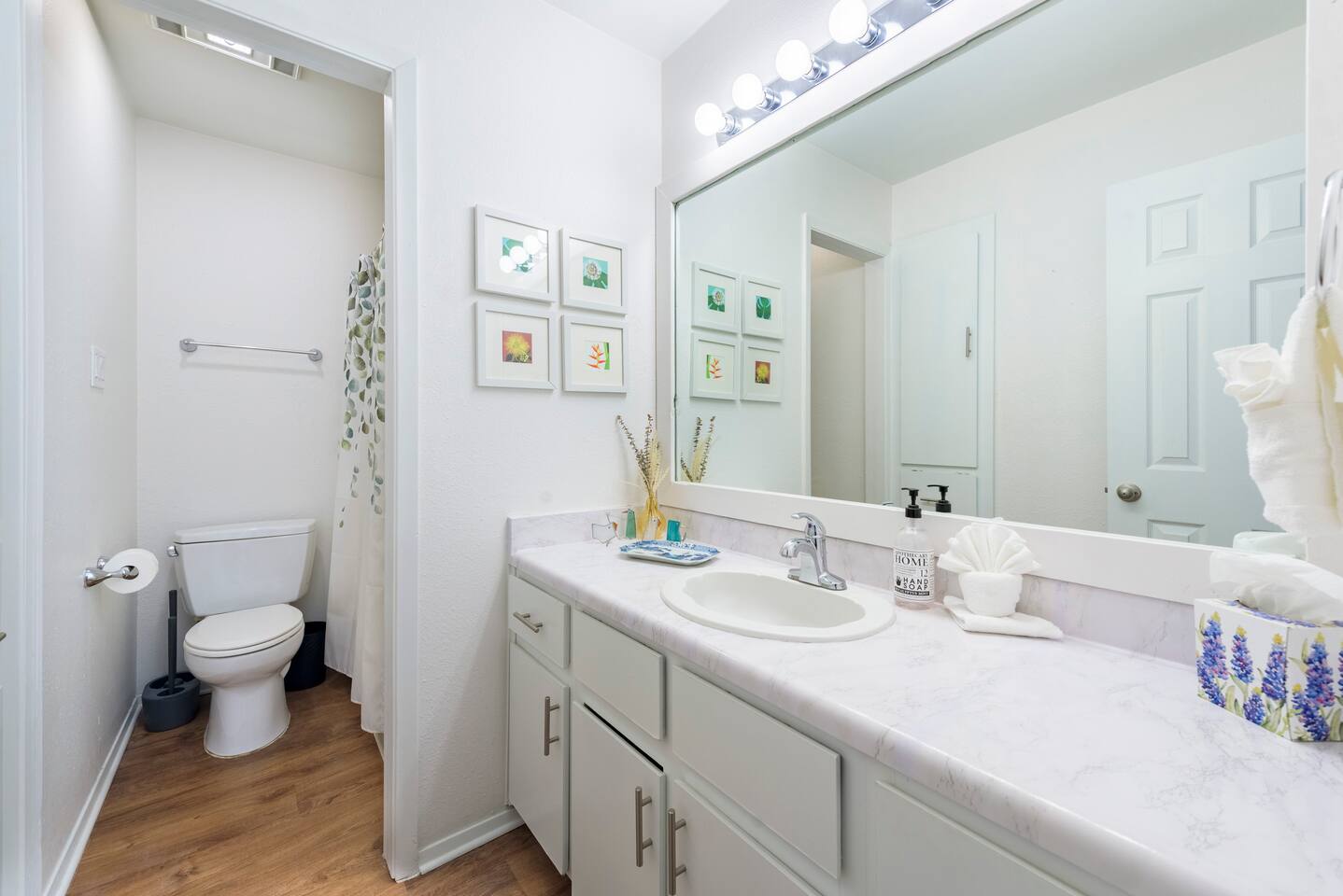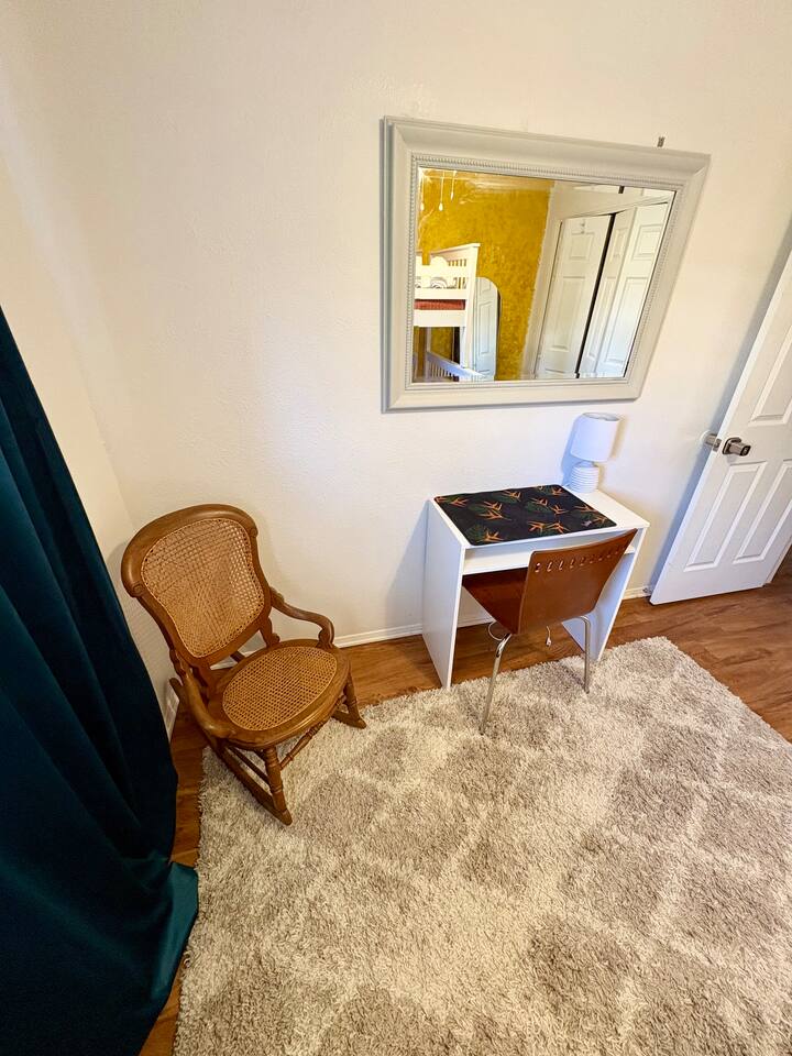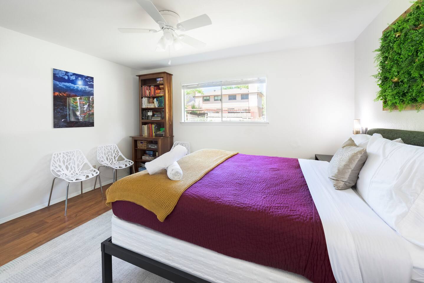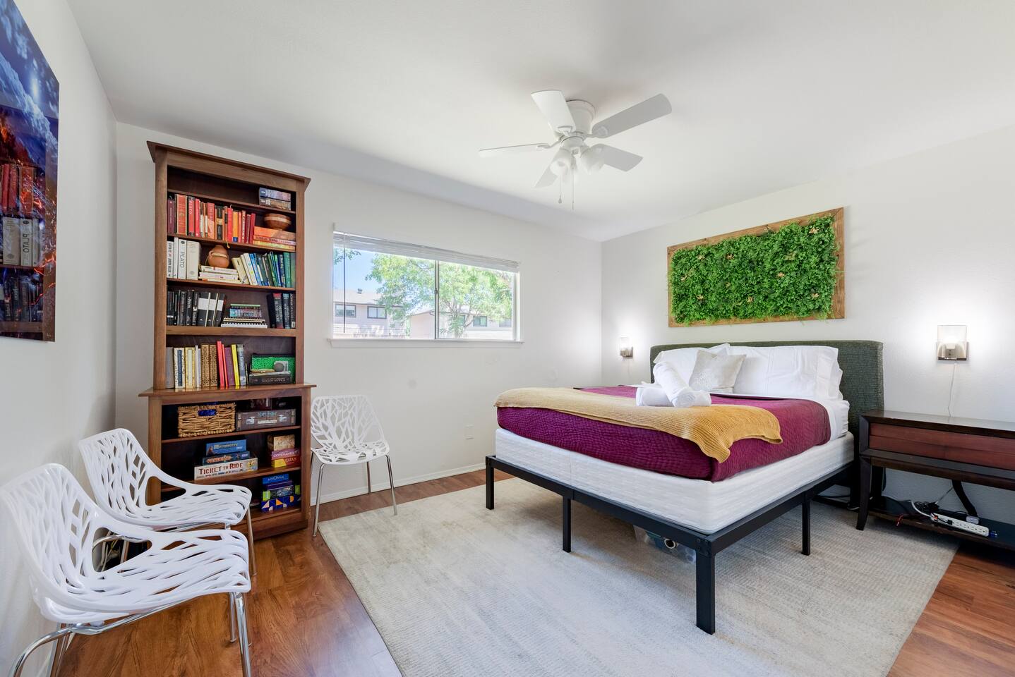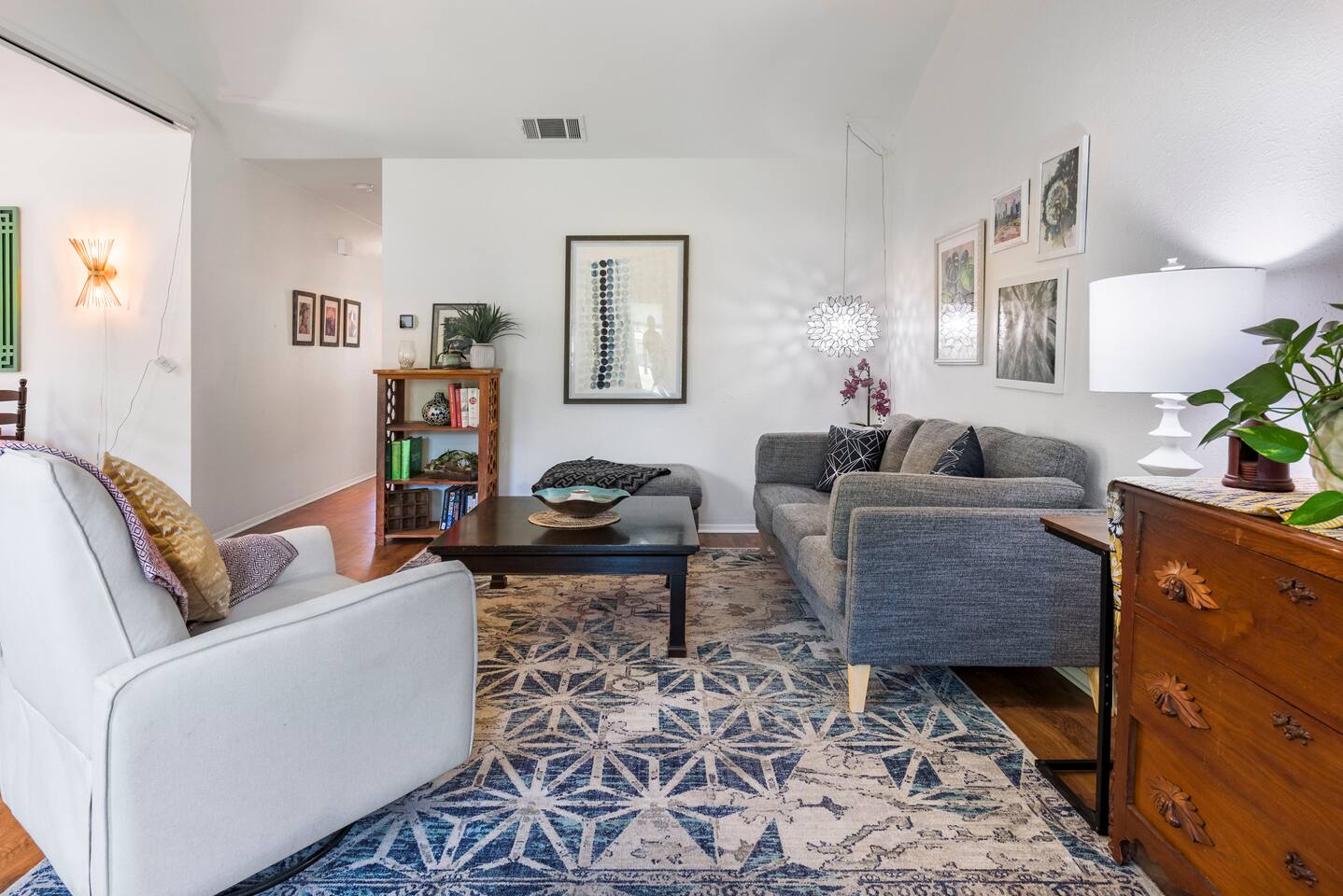 Welcome to your cozy 3-bedroom, 2-bathroom home in South Austin, designed for relaxation and connection. The bright, open-concept living area features high vaulted ceilings, creating a wonderful sense of space that flows seamlessly into a dining area and a fully equipped kitchen. Key Features: * **Living Area:** Gather for a movie night with the large pull-down projector screen. * **Kitchen:** A fully stocked kitchen with all the essentials to whip up a feast. * **Workspace:** A dedicated workspace with high-speed WiFi is available for remote work or planning your Austin adventures. Bedrooms & Bathrooms: * **Primary Suite:** Features a comfortable Queen bed and an attached full bathroom with a modern walk-in shower for added privacy. * **Bedroom 2:** Offers another restful Queen bed with soft linens. * **Bedroom 3:** Perfect for families, this room has a twin-over-full bunk bed set against a vibrant, cheerful wall. * **Shared Bathroom:** The hall bathroom includes a tub and shower combination, ideal for a relaxing soak. Backyard Oasis: Step outside to your private, fenced-in backyard to unwind. The cozy sitting area, illuminated by twinkling string lights, is perfect for evening chats. Gather around the fire pit for a starlit evening, or let your dogs play in the grassy space while you relax.