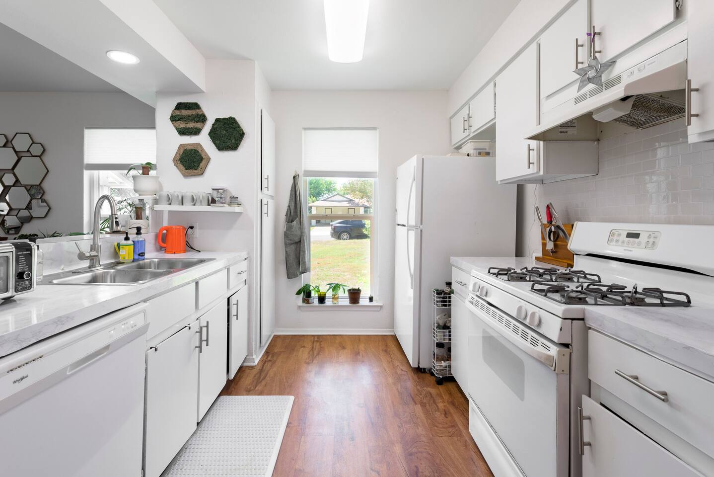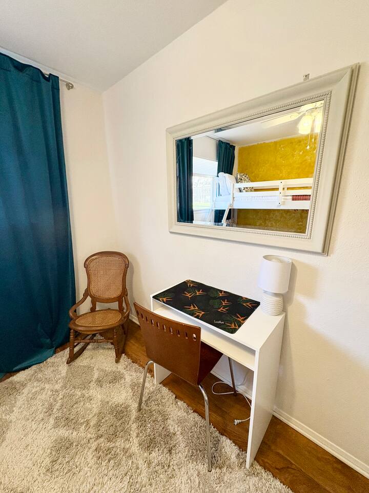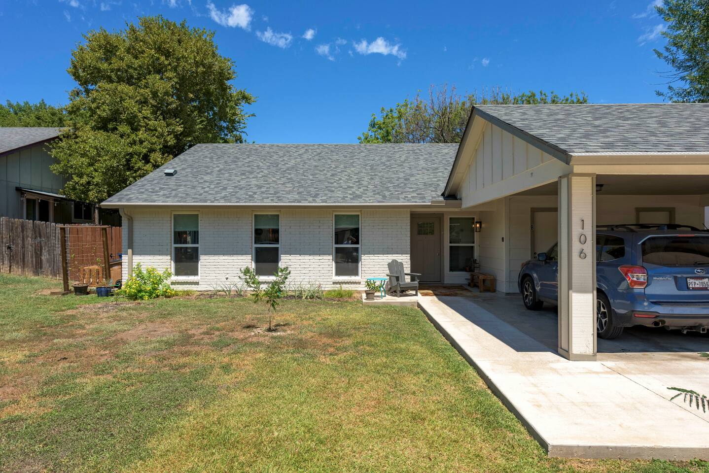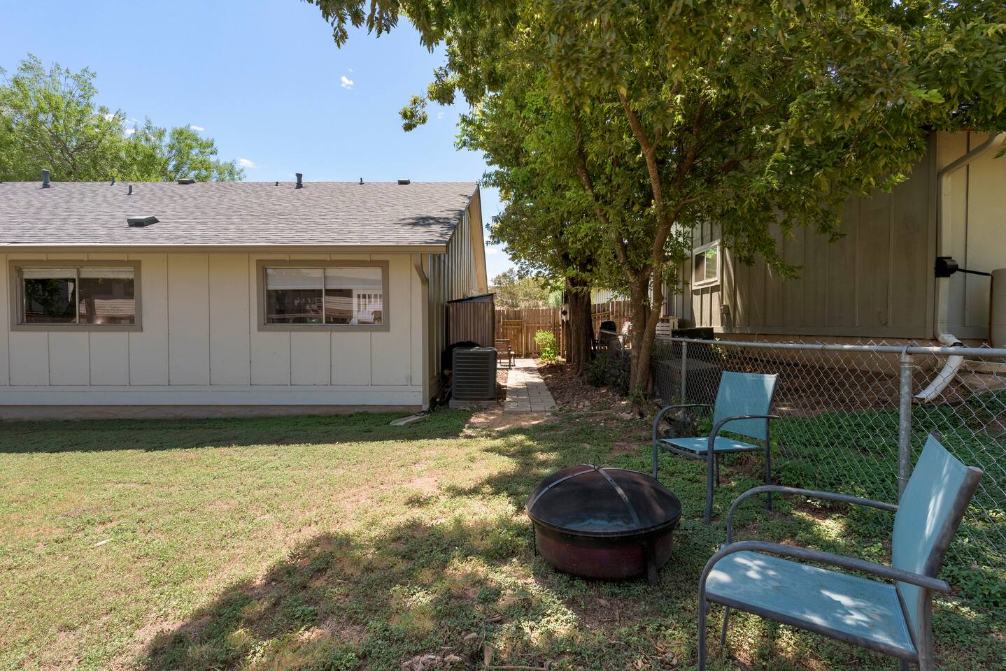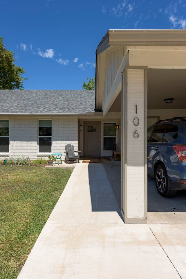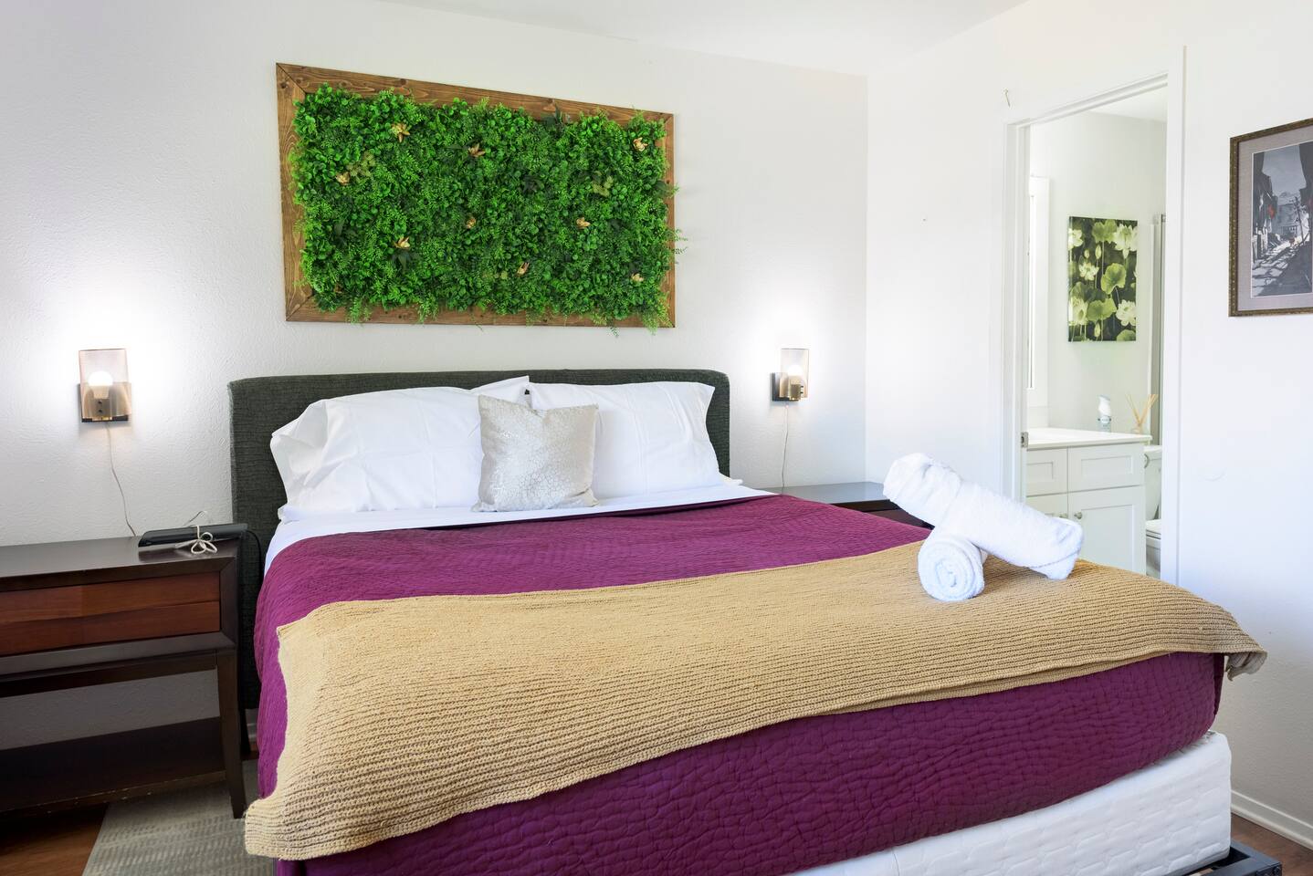 Welcome to your cozy 3-bedroom, 2-bathroom home in South Austin, designed for relaxation and connection. The bright, open-concept living area features high vaulted ceilings, creating a wonderful sense of space that flows seamlessly into a dining area and a fully equipped kitchen. Key Features: * **Living Area:** Gather for a movie night with the large pull-down projector screen. * **Kitchen:** A fully stocked kitchen with all the essentials to whip up a feast. * **Workspace:** A dedicated workspace with high-speed WiFi is available for remote work or planning your Austin adventures. Bedrooms & Bathrooms: * **Primary Suite:** Features a comfortable Queen bed and an attached full bathroom with a modern walk-in shower for added privacy. * **Bedroom 2:** Offers another restful Queen bed with soft linens. * **Bedroom 3:** Perfect for families, this room has a twin-over-full bunk bed set against a vibrant, cheerful wall. * **Shared Bathroom:** The hall bathroom includes a tub and shower combination, ideal for a relaxing soak. Backyard Oasis: Step outside to your private, fenced-in backyard to unwind. The cozy sitting area, illuminated by twinkling string lights, is perfect for evening chats. Gather around the fire pit for a starlit evening, or let your dogs play in the grassy space while you relax.